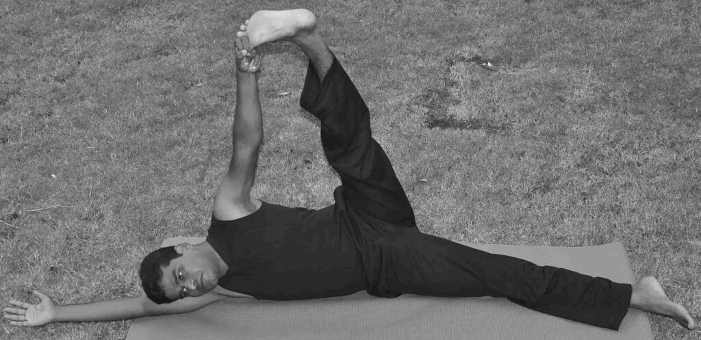 Anantasana is a supine side-lying balancing posture performed on the floor in which the practitioner lies on one side, supports the head with one arm, lifts the upper leg, and holds the big toe or foot with the upper arm.