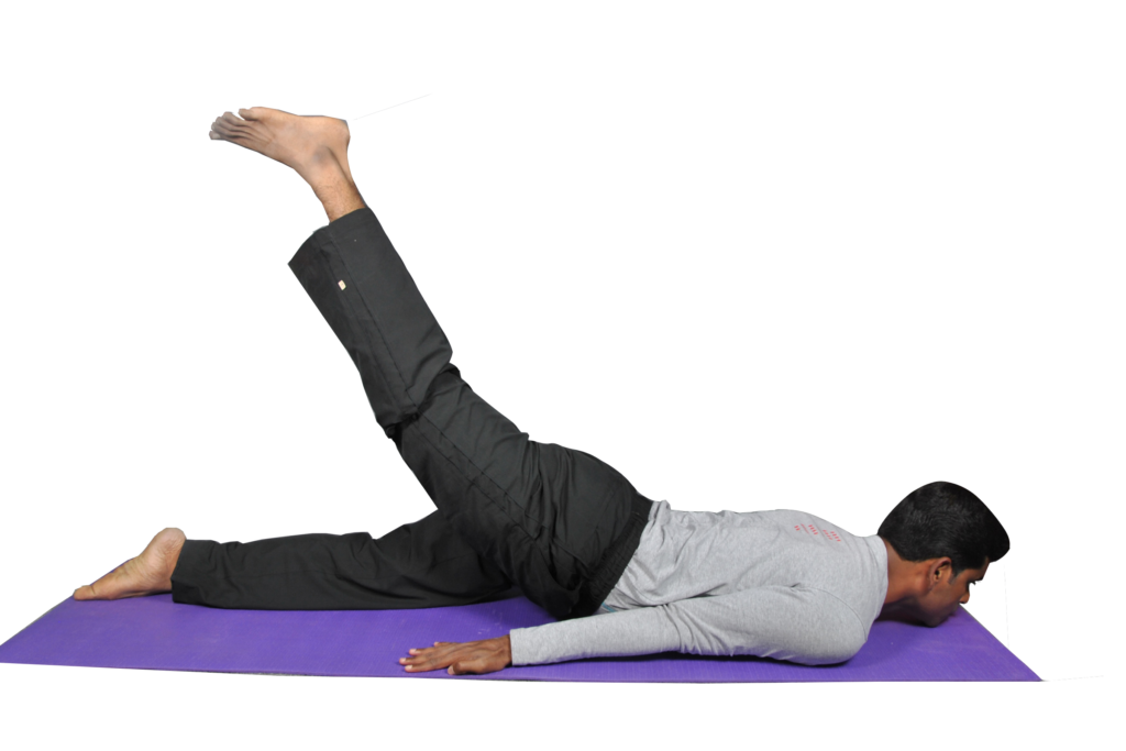 Ardha Shalabhasana is a prone posture in which the practitioner lies on the stomach and lifts one leg at a time off the floor while keeping the torso grounded, engaging the back muscles, glutes, and core. This asymmetrical, back-strengthening pose promotes spinal extension, hip mobility, and muscular coordination.