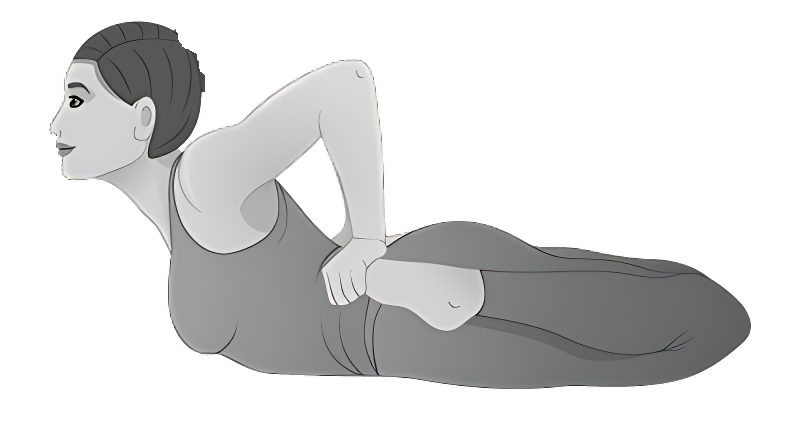 Bhekasana is a prone posture in which the practitioner lies on the stomach, bends the knees, and reaches the hands backward to grasp the feet, pressing them toward the floor while lifting the chest. This position resembles a frog, with thighs externally rotated, legs flexed, and torso lifted, creating a strong anterior stretch.
