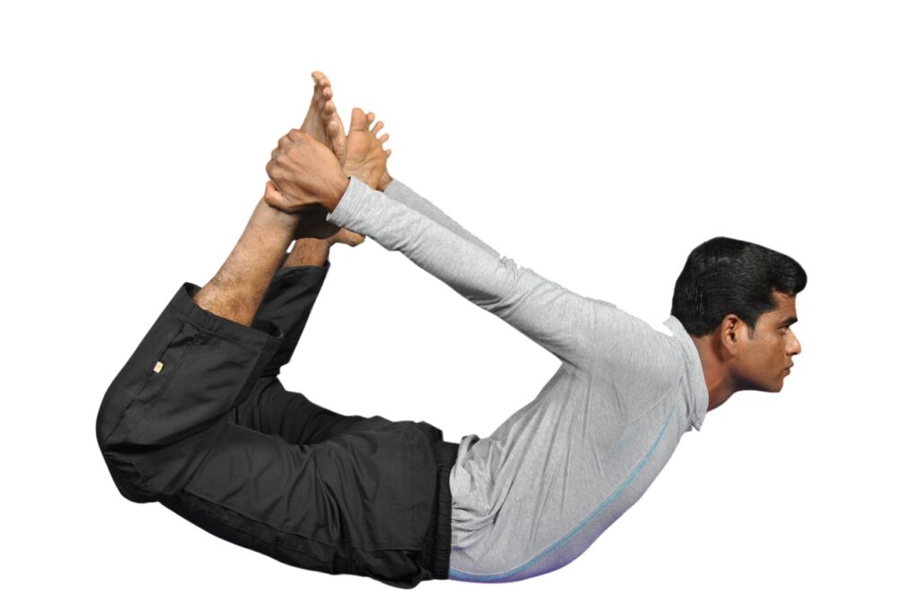 The name reflects the shape of the body in the pose—the torso and thighs form the curved body of the bow, while the arms resemble the bowstring.