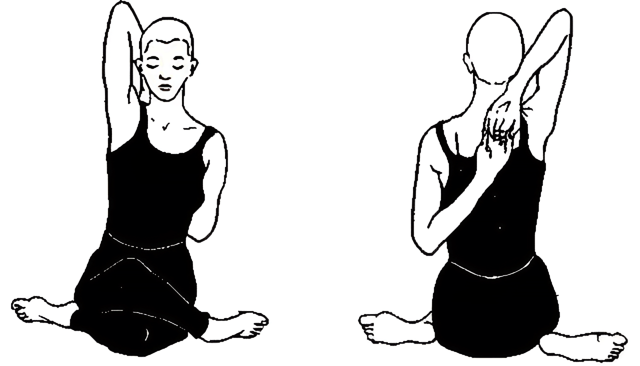 - Extend the left arm behind the back, palm facing forward, and try to clasp the right hand or fingers