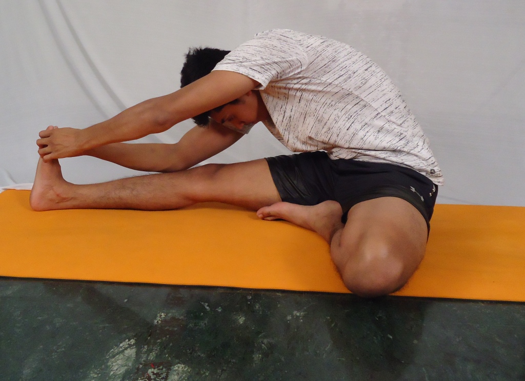 This is a pose in which you will attempt to touch your head to the knee. Sit on the floor and stretch your legs out in front of you. Bend the left leg and place the left heel as close to the right inner thigh as possible. Try and keep the right knee firmly touching the ground, it should not rise off. Make sure your legs are at an obtuse angle. Extend your arms forwards towards the right foot and hold it with both hands. Then, bending from the lower back, try and rest your forehead, then the nose and then the lips above the right knee. Stay here for about thirty seconds, breathing easily. Then come out of this pose and repeat it on the other side.