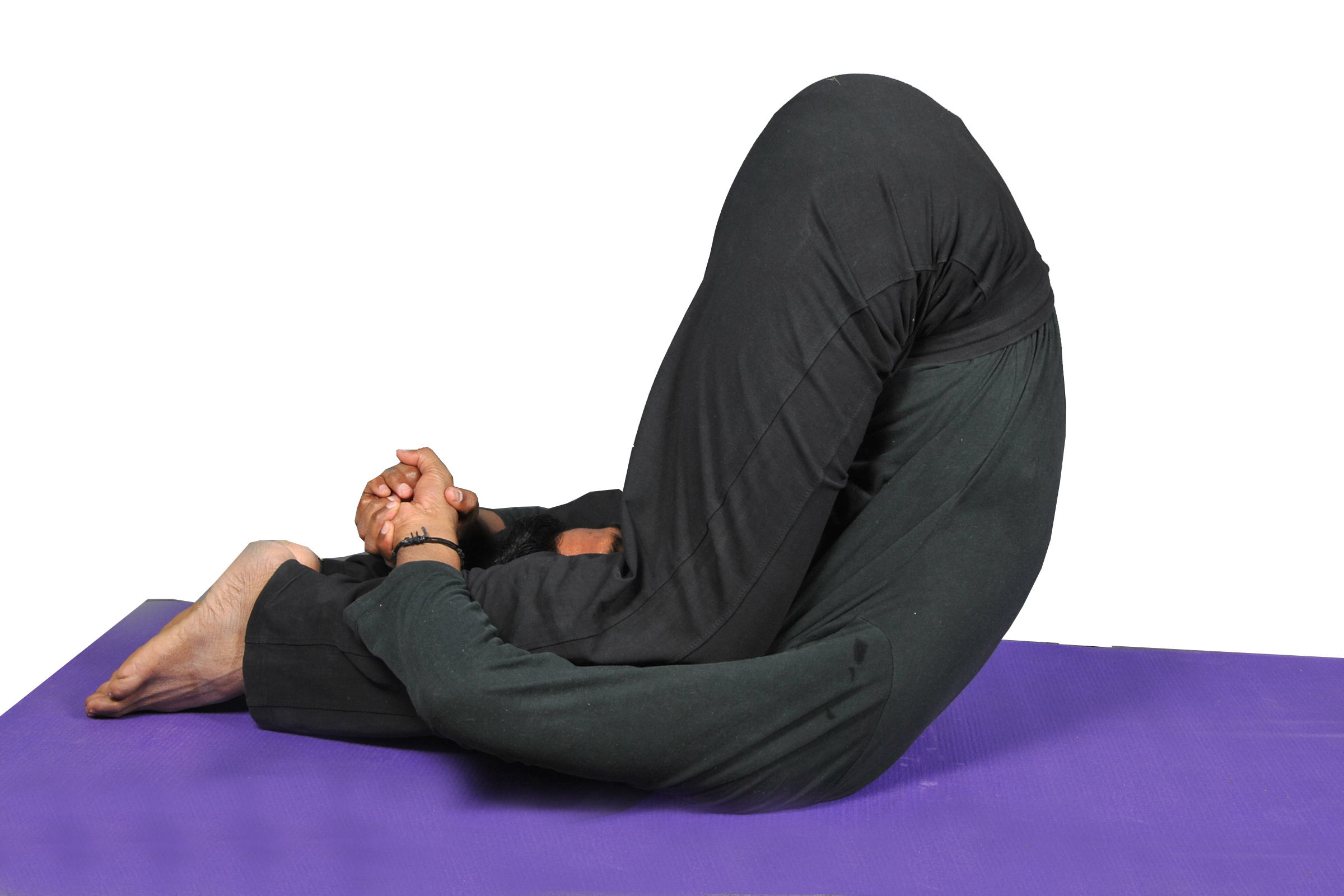 • To exit safely, release the knees slowly and extend the legs overhead again into Halasana.