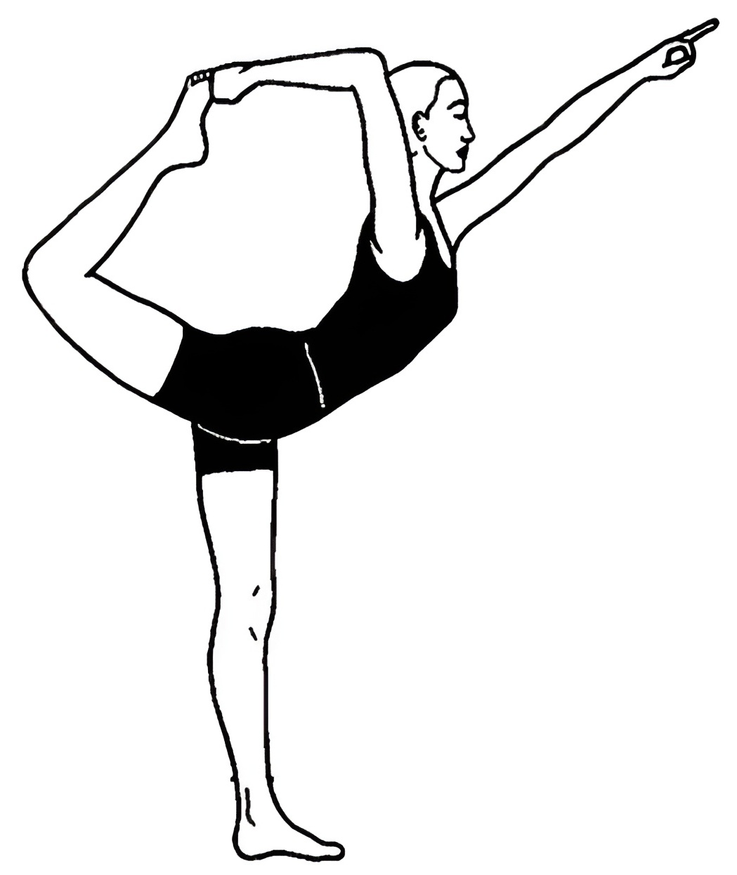 - Shoulder and chest expansion: One hand reaches back to hold the foot, opening the chest.