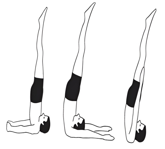 - Gradually straighten the legs upward, forming a vertical line from shoulders to toes.