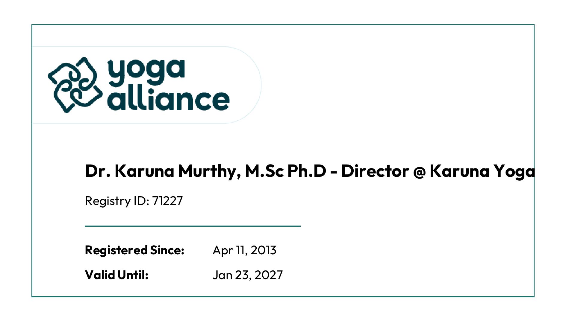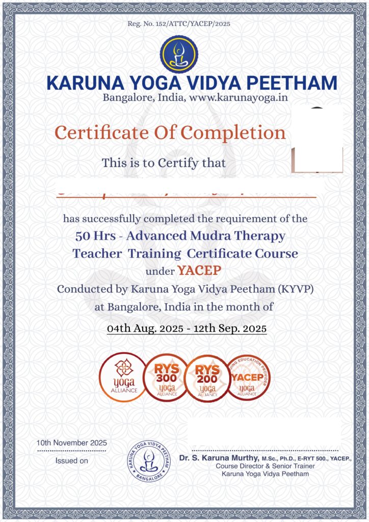 Karuna Yoga Vidya Peetham is a Registered Yoga School (RYS) with Yoga Alliance, USA.