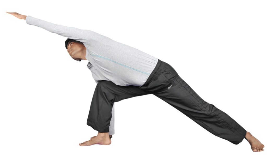 Parsvakonasana is a foundational standing yoga posture involving a deep lateral stretch of the trunk while maintaining grounded stability through the legs.