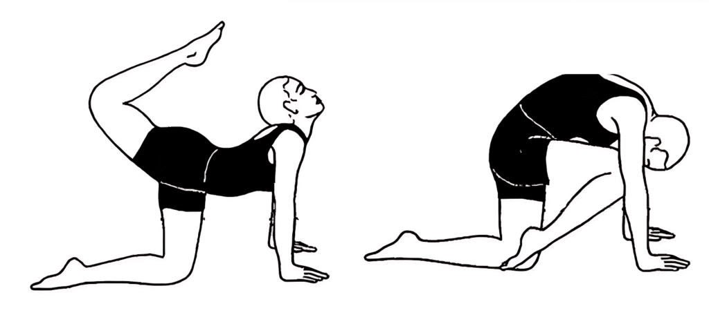1. Exhale – Round the spine (cat-like) and bring the knee toward the nose.