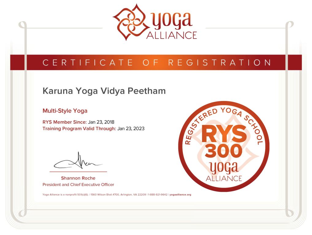 Karuna Yoga Vidya Peetham is a Registered Yoga School (RYS) with Yoga Alliance, USA.